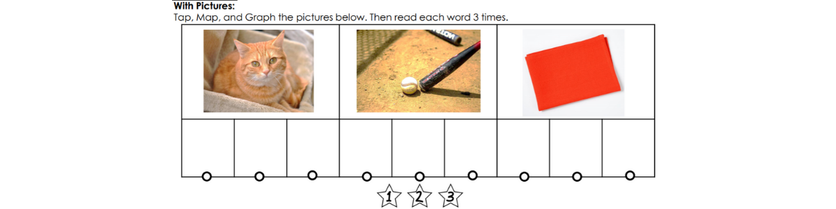 Map Words with Pictures: Tap, Map, and Graph using the pictures in the student book. Students will then read each word 3 times. Picture description in Lesson Plan.