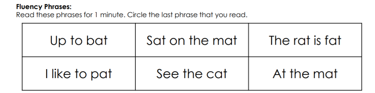 Fluency Phrases: To work on their fluency, students will practice reading short phrases from the decodable text. The students will read these phrases for 1 minute. If students finish the list before the 1 minute, they will return to the top and continue reading. When the timer goes off, they circle the last phrase they read.